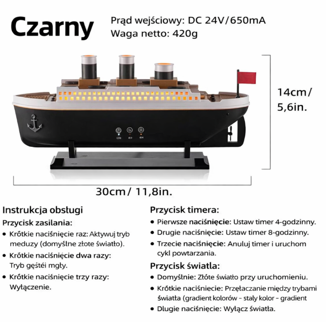 Ten model to realistycznie wykonany statek, który wytwarza delikatną mgiełkę przypominającą dym z kominów. Efekt wizualny w połączeniu z aromaterapią tworzy hipnotyzujący klimat relaksu.